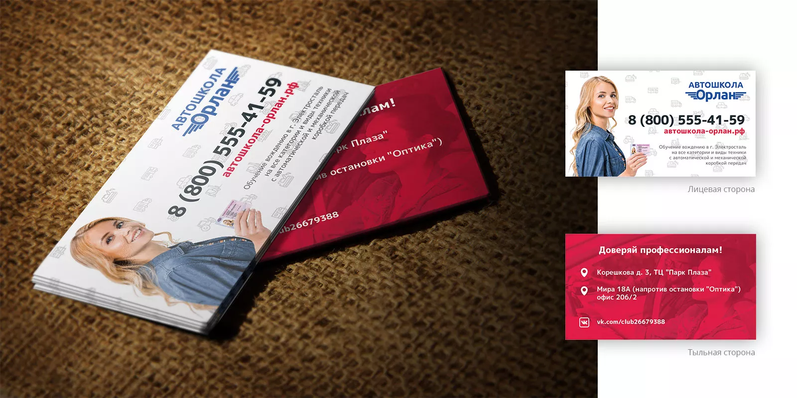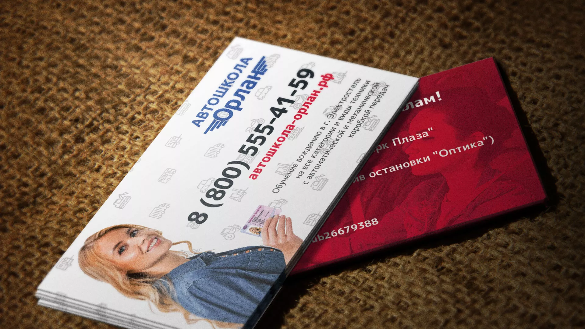 Разработка рекламных визиток автошколы «Орлан» в Калининске